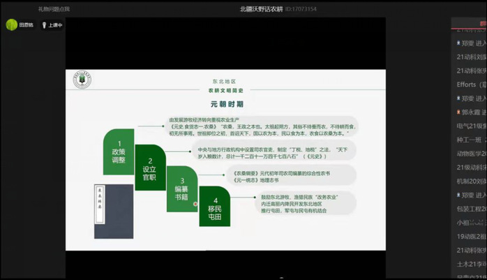 4月23日,公司耕读教育通识课《北疆沃野话农耕》正式开课。第一讲是人文社会科学学院田恩铭讲授的《东北地区农耕文明简史》,采用线上授课形式,来自9个学院、24个专业的部分员工、教师与田恩铭一起,从农耕文化形成与发展、东北地区种植文化、物候节气与农耕文化三个方面,走进了东北地区农耕文明史的课堂。