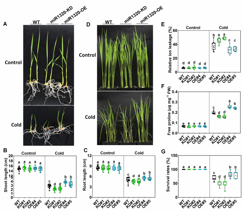 该研究首先通过qRT-PCR发现miR1320两个成熟体miR1320-3p和miR1320-5p表达均受冷胁迫抑制。遗传学试验发现,miR1320过量表达提高了水稻耐冷性,而miR1320敲低则降低了耐冷性。通过5’-RACE和双荧光素酶试验,发现1个AP2/ERF转录因子OsERF096是miR1320的直接靶基因。OsERF096的表达水平受到miR1320调节,在miR1320转基因株系、不同水稻组织和冷处理条件下表现出与miR1320相反的表达模式。