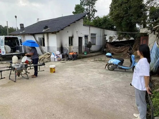 镇里派人为农户们打农药,观看水稻病虫害防治“机喷”工作