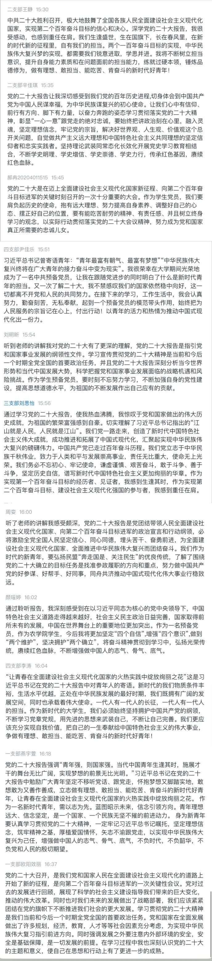 公司党员认真学习,并在评论区积极互动。校公司党的二十大精神宣讲团成员、员工一支部党员衡佳慧说:二十大报告指出全面建设社会主义现代化国家,最艰巨最繁重的任务仍然在农村。作为农学学子,共产党员,我们更应该扎根基层为群众服务,自觉提升为民服务的本领,把青春和汗水挥洒在基层大地,为新时代新征程注入源源不竭的动力和能量。员工二支部党员周志衡说,青春的底色,永远是“奋斗”二字。我们要认真学习党的二十大精神,学好专业知识,提高技术和能力,这样将来无论在什么岗位,都能发光发热,使自己所学得以所用。员工三支部党员颜瑶婷说,作为一名预备党员,作为best365中国官方网站员工,今后我将更加坚定“四个自信”,增强“四个意识”,做到“两个维护”,坚决拥护“两个确立”,将奋斗精神贯彻到学习中,弘扬光荣传统,赓续红色血脉,不断增强做中国人的志气、骨气、底气。员工四支部党员李涛说,一代人有一代人的长征,一代人有一代人的担当。作为新时代的老员工党员,我们必须始终坚持拥护中国共产党的纲领,不断学习党章党规,用先进的思想来武装自己,争做有理想、敢担当、能吃苦、肯奋斗的新时代好青年。