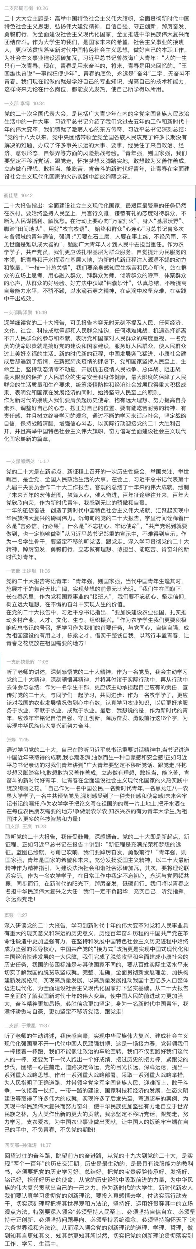 公司党员认真学习,并在评论区积极互动。校公司党的二十大精神宣讲团成员、员工一支部党员衡佳慧说:二十大报告指出全面建设社会主义现代化国家,最艰巨最繁重的任务仍然在农村。作为农学学子,共产党员,我们更应该扎根基层为群众服务,自觉提升为民服务的本领,把青春和汗水挥洒在基层大地,为新时代新征程注入源源不竭的动力和能量。员工二支部党员周志衡说,青春的底色,永远是“奋斗”二字。我们要认真学习党的二十大精神,学好专业知识,提高技术和能力,这样将来无论在什么岗位,都能发光发热,使自己所学得以所用。员工三支部党员颜瑶婷说,作为一名预备党员,作为best365中国官方网站员工,今后我将更加坚定“四个自信”,增强“四个意识”,做到“两个维护”,坚决拥护“两个确立”,将奋斗精神贯彻到学习中,弘扬光荣传统,赓续红色血脉,不断增强做中国人的志气、骨气、底气。员工四支部党员李涛说,一代人有一代人的长征,一代人有一代人的担当。作为新时代的老员工党员,我们必须始终坚持拥护中国共产党的纲领,不断学习党章党规,用先进的思想来武装自己,争做有理想、敢担当、能吃苦、肯奋斗的新时代好青年。