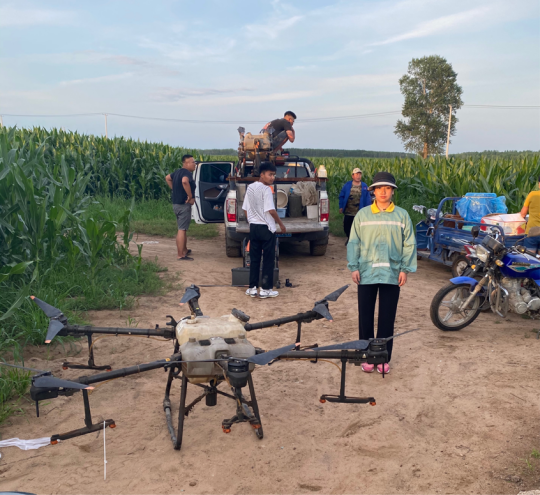 “热血沃黑土”暑期社会实践小队通过实地考察、调研走访的方式了解、学习了关山村无人机喷洒农药的田间试验。