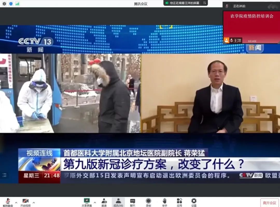 会上,学院着重强调了当前疫情的复杂形势,说明了开展《新型冠状病毒肺炎防控方案(第九版)》《高等学校新冠肺炎疫情防控技术方案(第六版)》内容学习的重要意义;与会教工共同观看学习了疫情防控相关视频片;并要求全院教工会后要针对两个方案进一步深入开展自学。