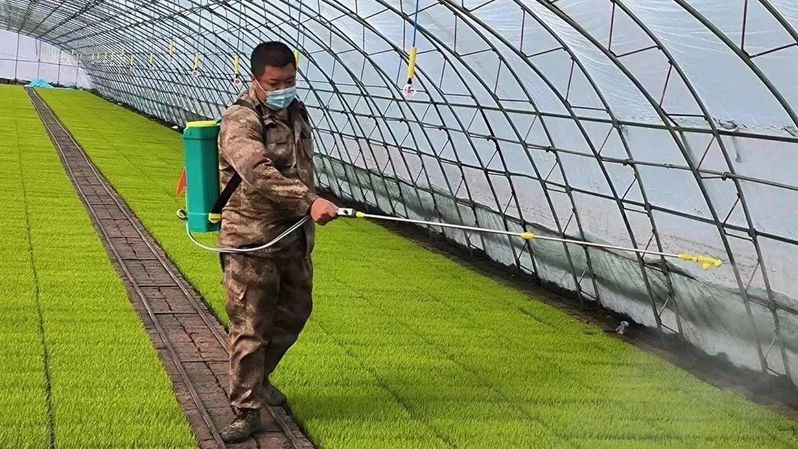给水稻秧苗打酸打药,预防病虫害。
