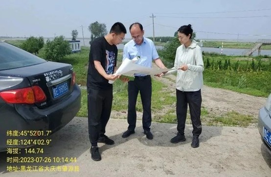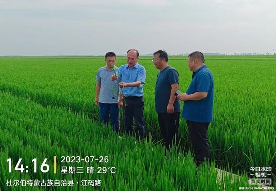 在杜尔伯特蒙古族自治县江湾乡,特派员一行在首先进行了田间调查,详细了解了对当地水稻种植的情况,并对当地区域试验改进提出了具体建议。随后参观和走访了江湾乡排灌站和江湾乡政府,与江湾乡乡长丁晓伟和副乡长张志刚就进一步水稻栽培技术合作和人才引进等进行了深入沟通。