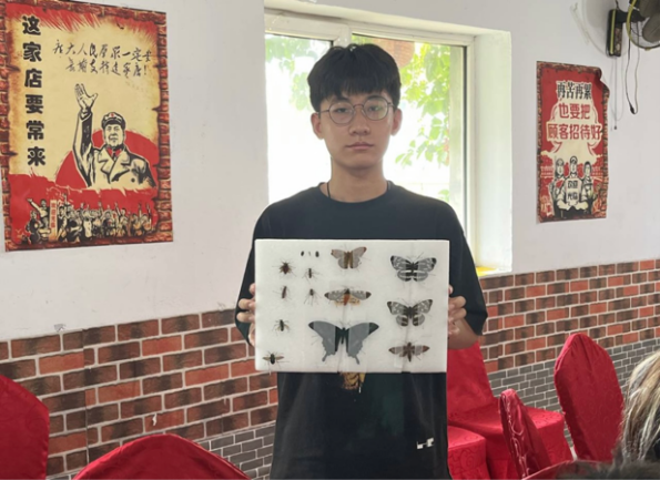 与昆虫标本合影
