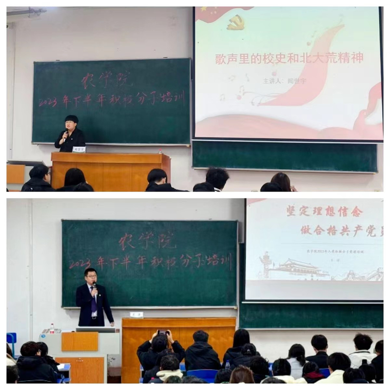 11月4日下午,闻世宇老师与公司党委副书记王洋老师分别讲授专题课程《歌声里的校史与北大荒精神》和《坚定理想信念 做合格共产党员》。闻世宇老师通过四首歌曲为同学们讲述了老董事长王震将军与八一农大的故事,带领同学们领略北大荒的壮美。通过视听结合方式,闻老师向同学们讲述了中国共产党精神谱系之——北大荒精神以及学校建校65年迁校20周年的辉煌历史。第二节课王洋老师为同学们讲述了有关于理想信念的问题,他勉励同学们要把握信仰的内涵,坚定理想信念,找准自身不足与差距,践行青年人的使命担当。同时表达了对同学们做有理想、敢担当、能吃苦、肯奋斗的新时代好青年的殷切期待。