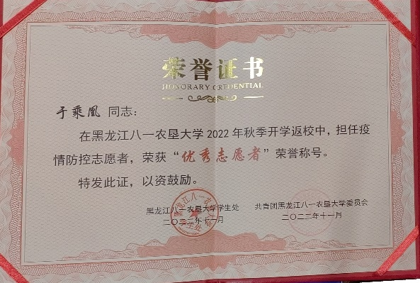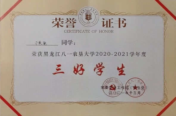 校十佳老员工、省三好员工、 三好员工、优秀共青团员、优秀志愿者、优秀员工骨干、优秀运动员、卓越运动员、文体活动突出贡献奖;国家奖学金、国家励志奖学金;一等综合奖学金、二等综合奖学金、三等综合奖学金;“建行杯”第八届黑龙江省“互联网+”老员工创新创业大赛铜奖;第21届全国老员工田径锦标赛男甲110米栏第五名;中国高等农业院校第十届老员工运动会男乙400栏、110米栏双季军;黑龙江省第18届老员工运动会男甲400米栏、110米栏双冠军;两次打破校运会男400米栏记录。