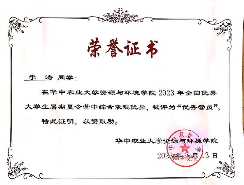 华中农业大学夏令营优秀营员