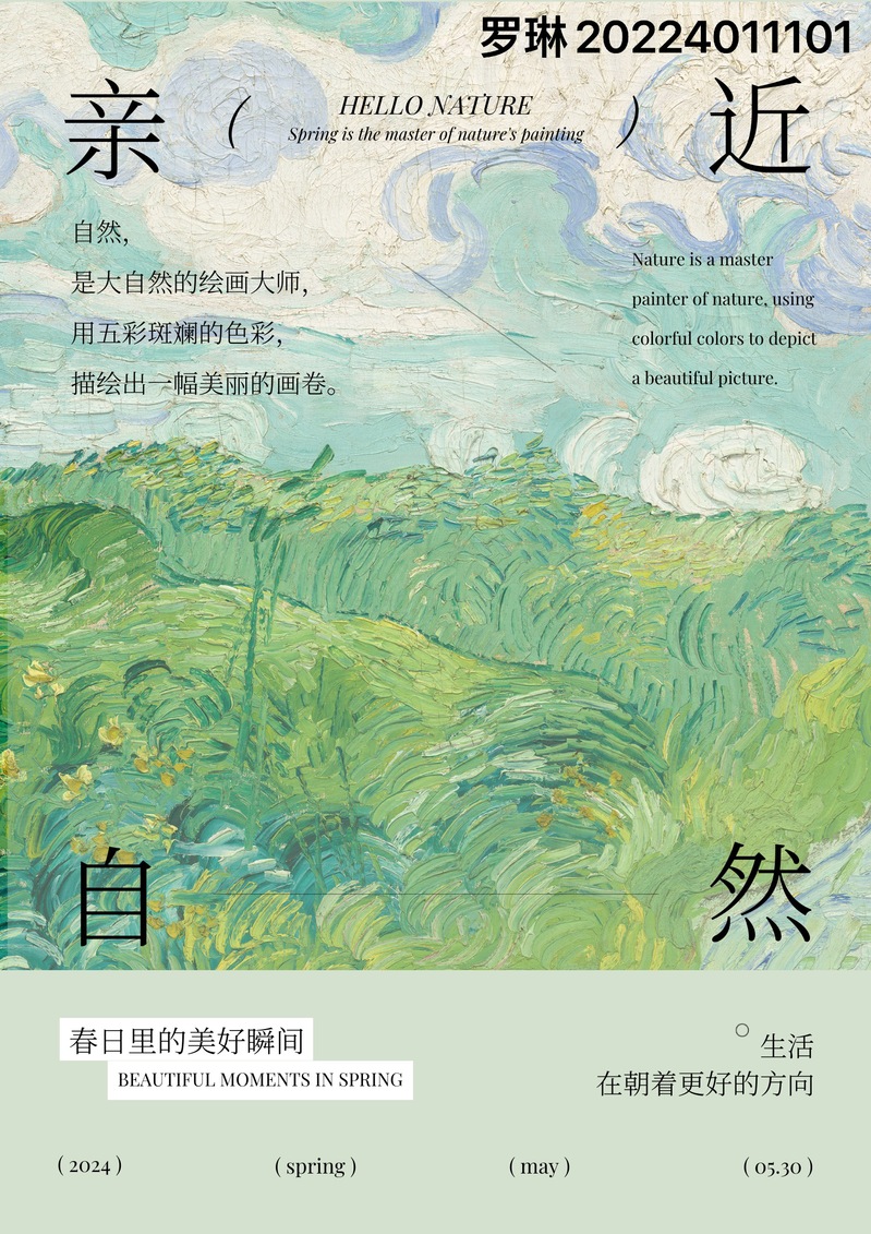 对于农学学子来说,大自然是最好的老师。为了更好的向员工宣传普及亲近自然的精神, 让员工不局限于从书本和课堂上了解自然, 而是能够切身投入进大自然中,将亲近自然落实到行动中,学院廿四风植物艺术社团举办“与自然同行”海报征集活动。