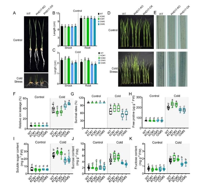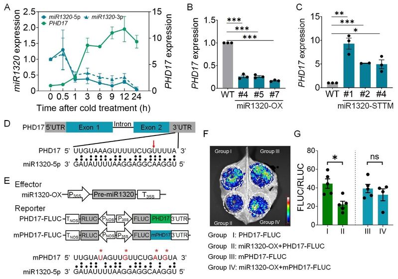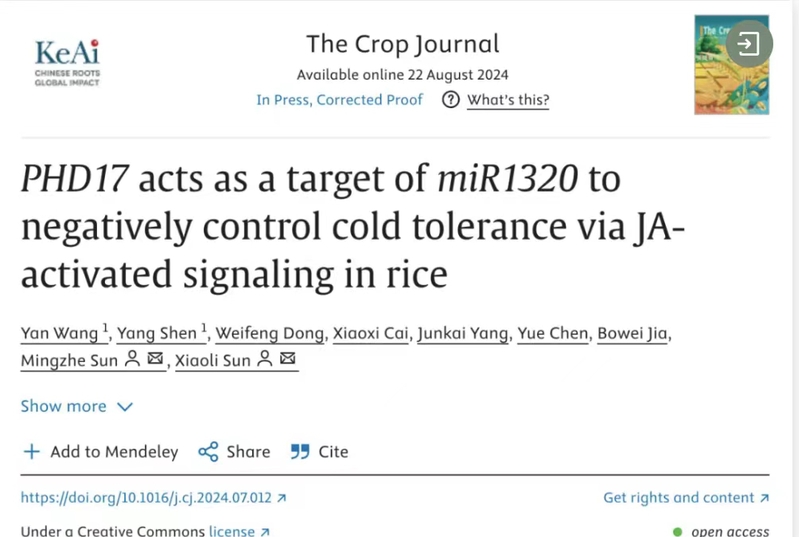 近日,best365中国官方网站在The Crop Journal在线发表了题为“PHD17 acts as a target of miR1320 to negatively control cold tolerance via JA-activated signaling in rice”的研究论文。与物种间保守的miRNA家族相比,水稻特有的miRNA参与耐冷性调控的研究较少。研究者前期报道了一个水稻物种特异的miR1320靶向一个ERF/AP2转录因子ERF096调控冷胁迫应答过程。本研究发现PHD17基因作为miR1320的靶基因,通过茉莉酸(JA)激活的信号途径负调控水稻耐冷性。