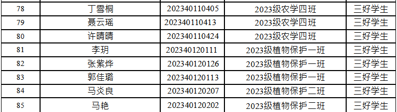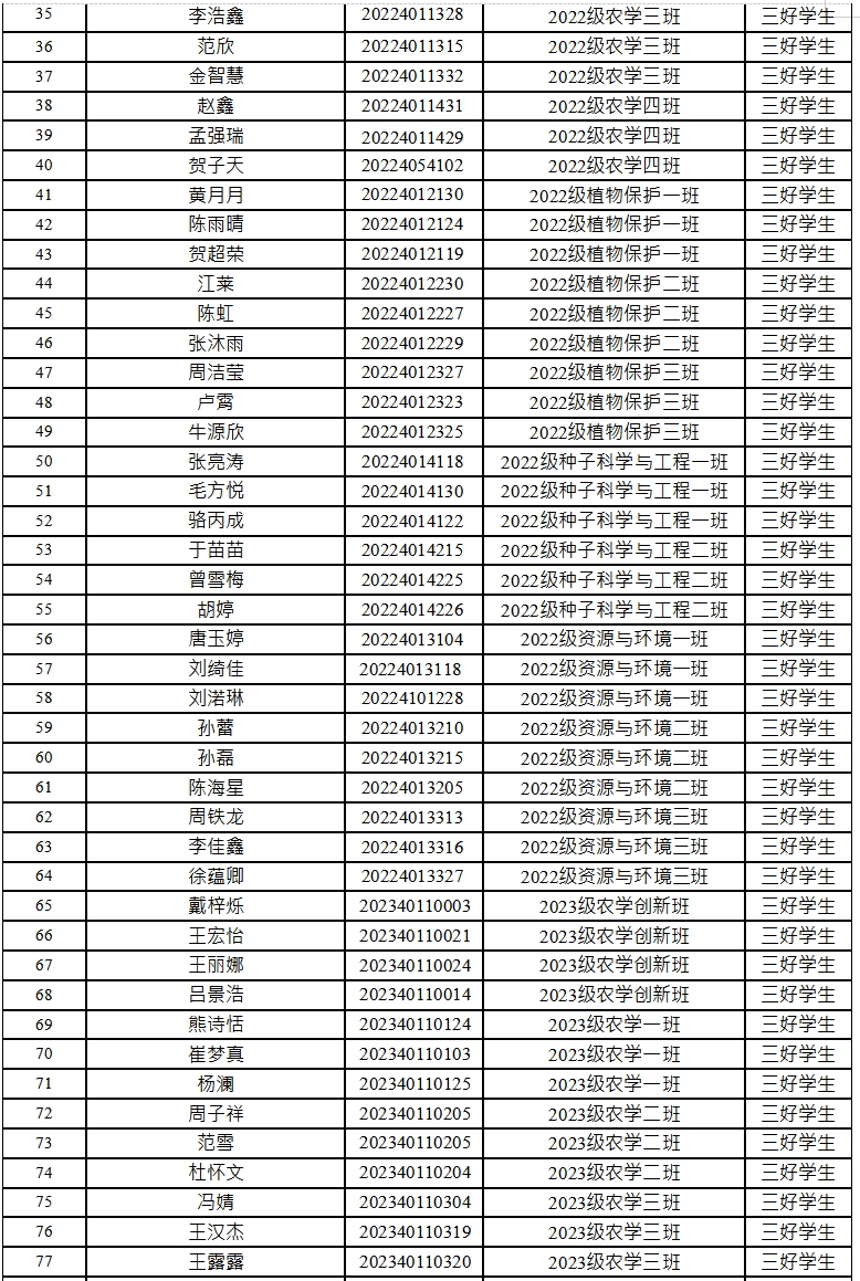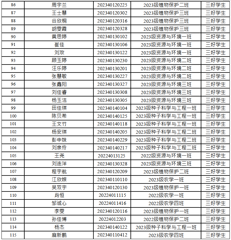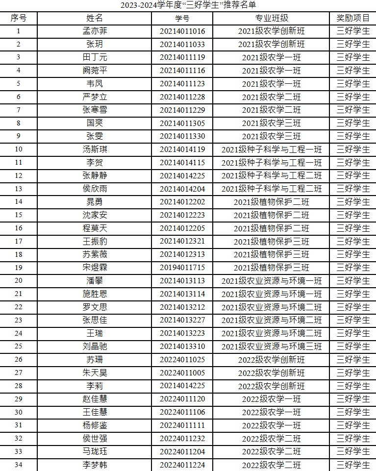 根据学校《关于评选2023-2024学年综合奖学金、先进集体和先进个人的通知》要求,依据《best365中国官方网站本科生奖励规定》,经自主申报、资格审核、班级测评、评审委员会评审,最终推荐2021级农学一班等11个班级为“优良学风班”荣誉称号,推荐孟亦菲等115名本科生为校级“三好员工”荣誉称号,现予以公示,详细名单见附件。
