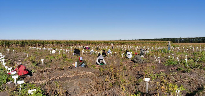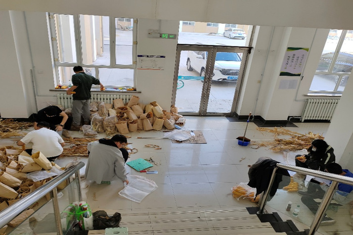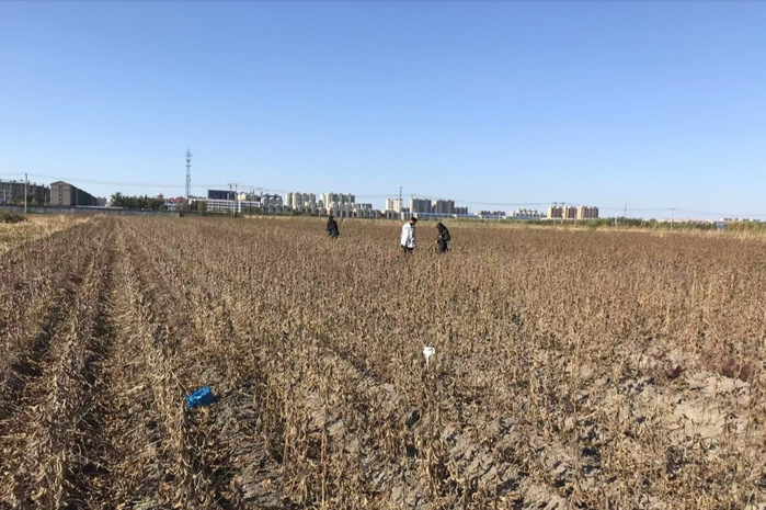 9月28日,由王孟雪副教授、四名相关专家及部分研究生组成的团队,在黑龙江省双鸭山市友谊县友谊农场进行测产。团队于每处田中选取了三个小区,每个小区测量了亩株数,并选取两平方米面积的植株取回待测量考种。
