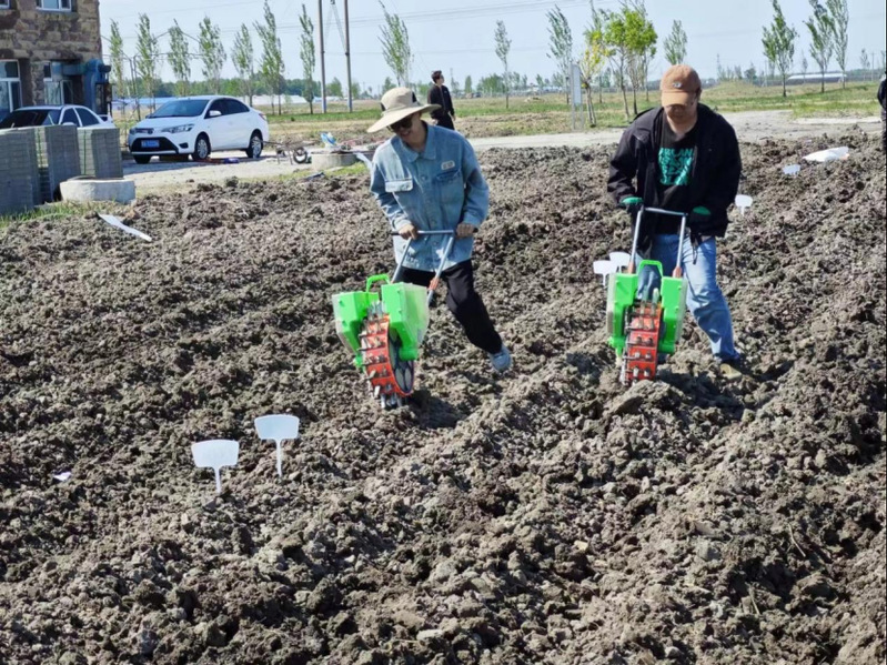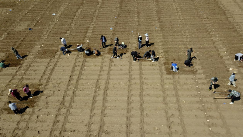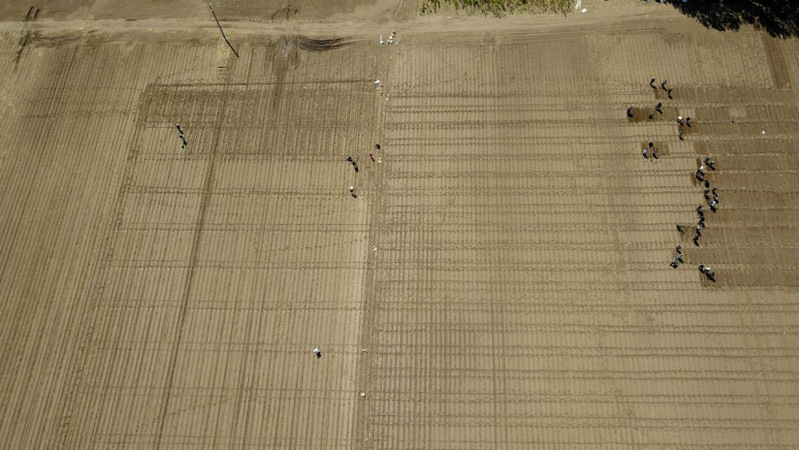 航拍视角下人工开垄播种。