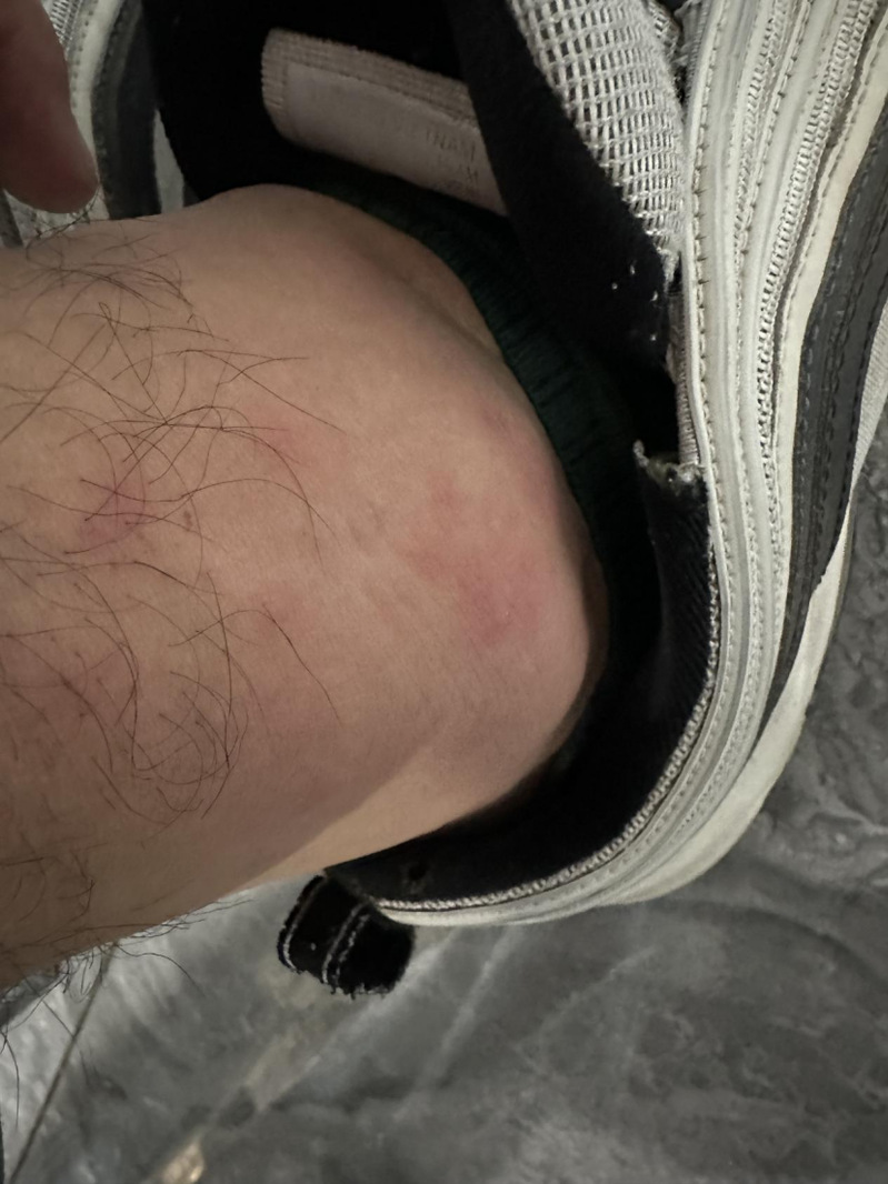 被肆虐的蚊虫叮肿的脚脖。