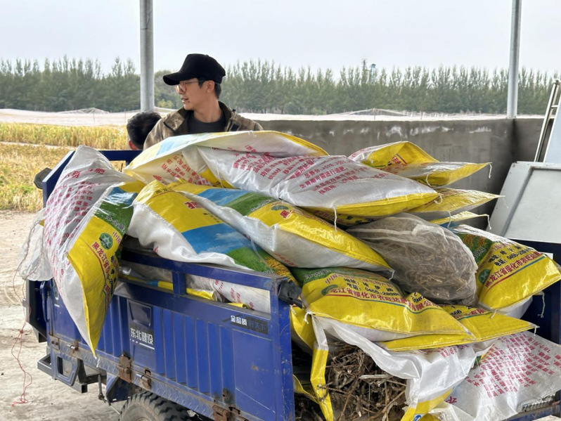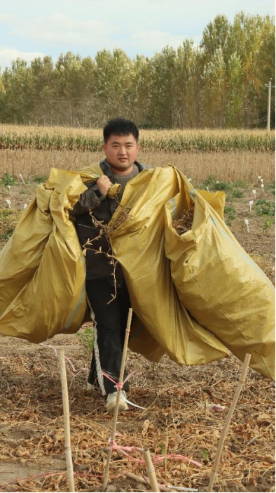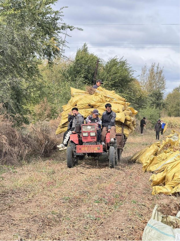 工人们割完豆子,为防止在地里丢失,全部打包带走,一个个小伙们干劲十足,恨不得一次全给搬出去。