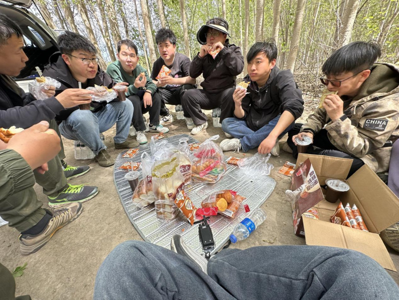春播期间为赶时间播种,中午导师们和研究生们一起在田间地头吃午饭。