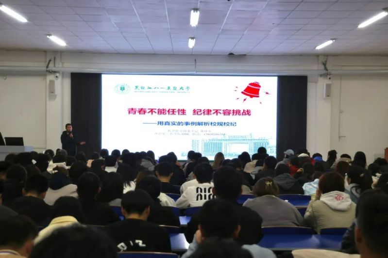 引导新生尽快熟悉校规校纪、规范在校行为、强化遵纪守法意识、营造良好校园氛围。10月29日晚,学院在主楼副楼128教室开展以“青春不能任性,纪律不容挑战”为主题的2024级新生入学教育之校规校纪教育,会议由黄伟东老师主讲,2024级新生参会。
