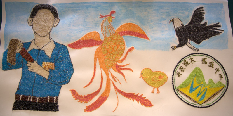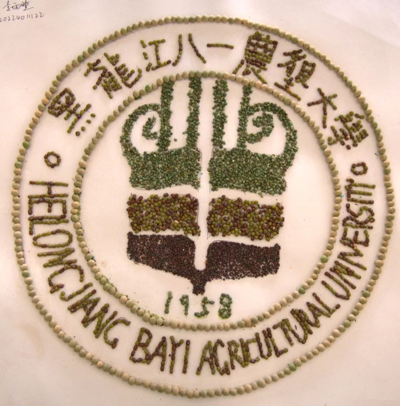 创作理念:本作品以菠菜,大豆,绿豆等种子描绘了best365中国官方网站校徽,校徽以麦穗和笔尖为基本元素,麦穗象征农业,笔尖象征科教,两者融为一体,巧妙互喻,三对麦粒似书卷与禾苗,具有生生不息,积厚成器之势。底部的黑色象征着黑土地,上部绿色给人以生机勃勃之感,云纹线条则传递着中国文化气息,校徽以盾形为整体外形,代表坚固,稳重和持久,同时也是锹和犁的形态,体现培养人才的治学理念,上部象征进取和开放,下部表现面向社会的办学主旨。八一农大局负着托举农业未来的重任,传播知识与培养农科英才。