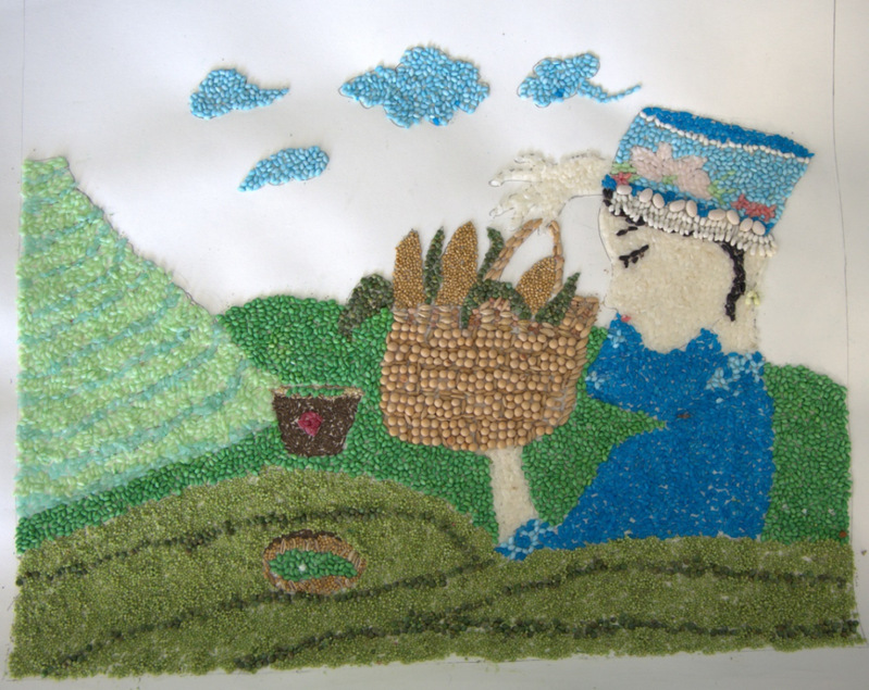 创作理念:我的种子画创作的主题是“非遗文化与农业的碰撞”。种子画的主要元素有梯田、茶园,还有收获了一大筐玉米的土家族少女。种子是农业发展的芯片,农业发展兴旺是国家发展的基础,可随着更多产业的兴起,农业生产带给农民的收入显得更是微薄。因此,农产品的销售渠道和方法的创新发展尤为重要。所以,我想到用民族非遗文化的方式能吸引更多人关注到乡村农产品的高品质,而且还能弘扬我国优秀传统民族文化,让农业与非遗文化发展齐头并进。画中少女坠满银饰并带有各种纹样的帽子、耳环和服饰,都是中国少数民族土家族的传统服饰,还有装满玉米的竹篮、作物地里的簸箕,也都是土家族的传统技艺——竹编和藤编。有着用中国优秀传统民族非遗文化托起农业高产、稳产,繁荣发展的梦的美好寓意!