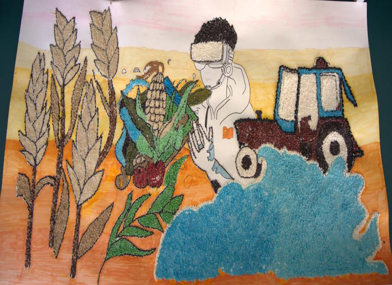 创作理念: 本幅作品利用小米,绿豆、水稻等多种种子构建玉米,人类,拖拉机等多种元素描绘出一副未来智慧农业的场景,通过历史的车轮将过去的农业与高科技农业历史的推进链接起来。右下角的海浪含义是长江后浪推前浪,寓意着中国的农业发展会逐步推新,形成高科技、高品质、高产量农业。利用小麦,玉米等多种元素环绕的人物,代表着我们新一代怀揣着梦想和坚定信念的青年农科学子。一代代新青年的涌现,带领着我们共同走向农业美好的未来。未来的农业是什么样的呢?这个问题谁都没有定论,但我们希望未来的小麦能够为人类纳阴遮凉,未来的玉米粒粒饱满、颗颗香甜,未来的农科学子将掌握高科技现代化农业技术知识,为人类的粮食安全提供保障。