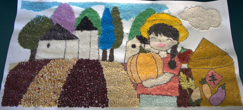 创作理念:整幅画是利用水稻、小米、绿豆、黑米、小麦、糯米、白芸豆、黑豆、红豆、黄豆、贵族菠菜、高粱等种子构成稻谷堆、稻田、收割机、田间小路、山间河流、桥、粮仓、连绵起伏的山、太阳及蓝天白云等元素。