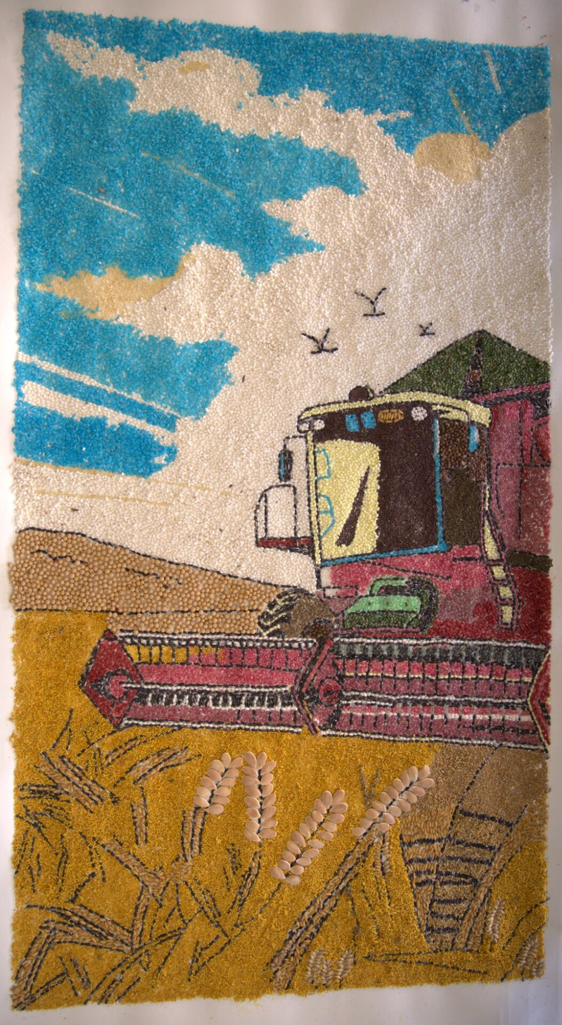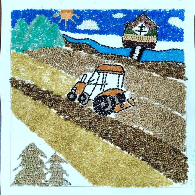 创作理念:作品以农机齐上阵,麦收正当时为理念,科技助农增收为核心,我们通过种子作画的形式展现一个麦收的黄金时期,农机上阵,田间地头一片繁忙景象。传达农业现代化是实现高质量发展的必然要求。唯有通过技术引领提高农业科技水平,才能不断地推进农业现代化建设,实现农业农村高质量发展的理念。