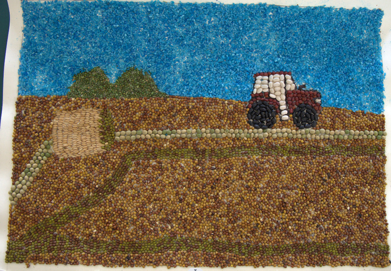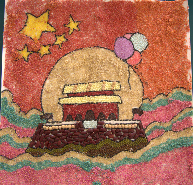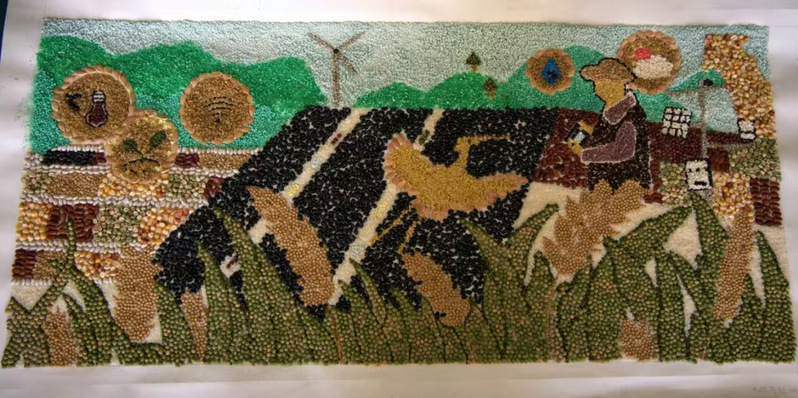 在种子画中,色彩的运用同样重要.通过红色和黄色等暖色调的巧妙搭配,营造出温馨、愉悦的氛围。图中的田地由红色和黄色拼成,既象征了丰收的喜悦,也表达了人们对美好生活的向往和追求。