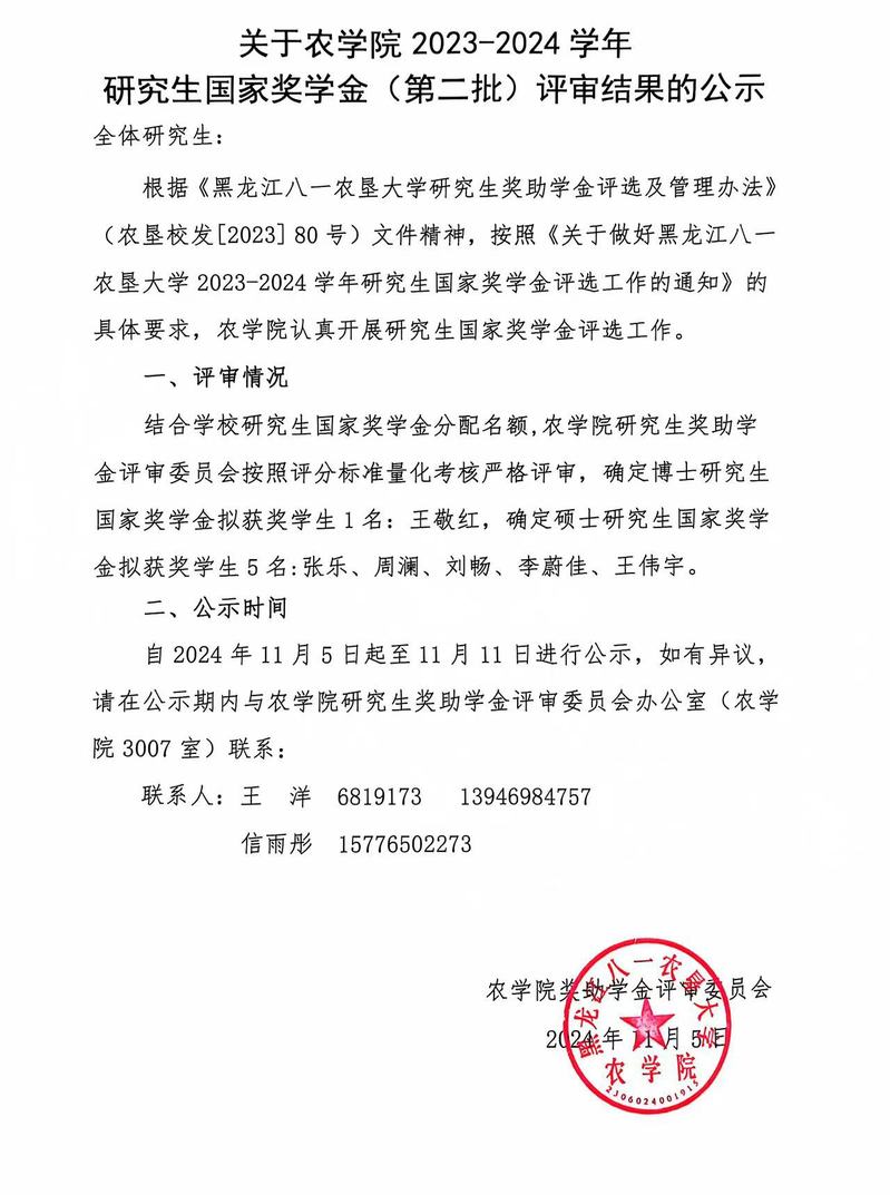 关于best365中国官方网站2023-2024 学年 研究生国家奖学金(第二批)评审结果的公示