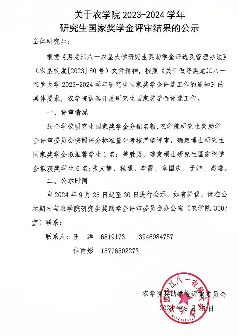 关于best365中国官方网站2023-2024学年 研究生国家奖学金评审结果的公示