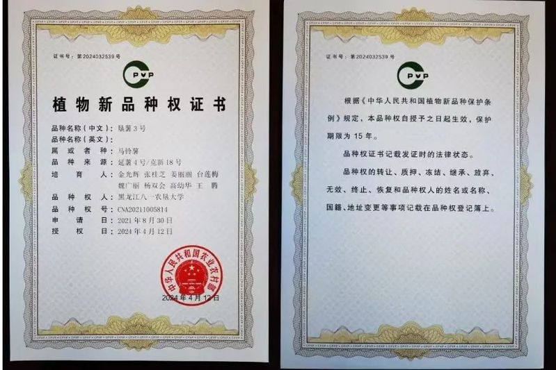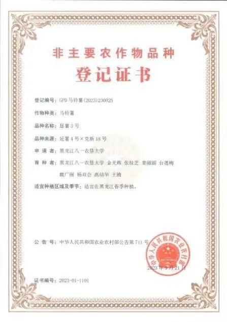 近日,垦薯3号马铃薯新品种的植物新品种权证书正式下发,该品种是黑龙江省科技厅马铃薯揭榜挂帅项目“高淀粉高产广适性马铃薯种质资源创新与新品种选育”的主要成果,也是公司继垦薯1号、垦薯2号淀粉加工专用型马铃薯品种选育推广之后的又一淀粉加工专用型品种。公司马铃薯种质资源创新及新品种选育团队秉承北大荒精神艰苦奋斗、勇于开拓,深耕科研育种多年,先后培育优秀马铃薯新品种6个,已成果转化4个,垦薯3号是继培育出高端鲜食品种红粉佳人且于2022年获得国家新品种保护授权品种之后,又一获得新品种保护授权的新品种。