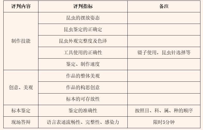 主要考察昆虫标本的制作步骤与技能,包括还软、针插、整姿与展翅、干燥与保存、鉴定等,并根据需要进行口头答辩。限时20分钟,满分40分。