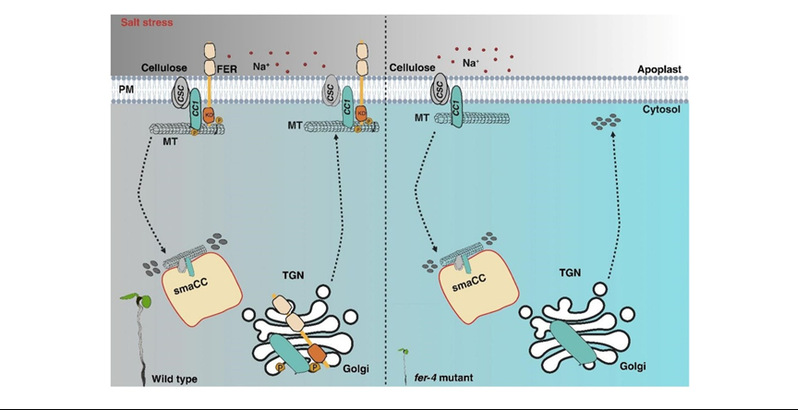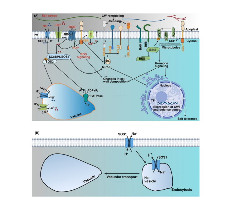 在盐胁迫下,植物通过多种生理与分子机制维持细胞壁功能与完整性。SnRK2-SPR2模块通过微管重排调控根的避盐生长,BR信号则经BIN2-BES1通路调控XTH表达以增强细胞壁可塑性。SOS信号途径激活Na⁺/H⁺逆向转运和囊泡介导的Na⁺区隔化,有效降低胞内Na⁺毒性。此外,Ca²⁺激活的RBOHs产生活性氧,促进细胞壁交联,对CWI至关重要。细胞骨架通过调控CESA复合物定位与活性参与纤维素合成,其中FER激酶通过磷酸化CC1介导微管重组,直接促进盐胁迫下纤维素的生物合成。
