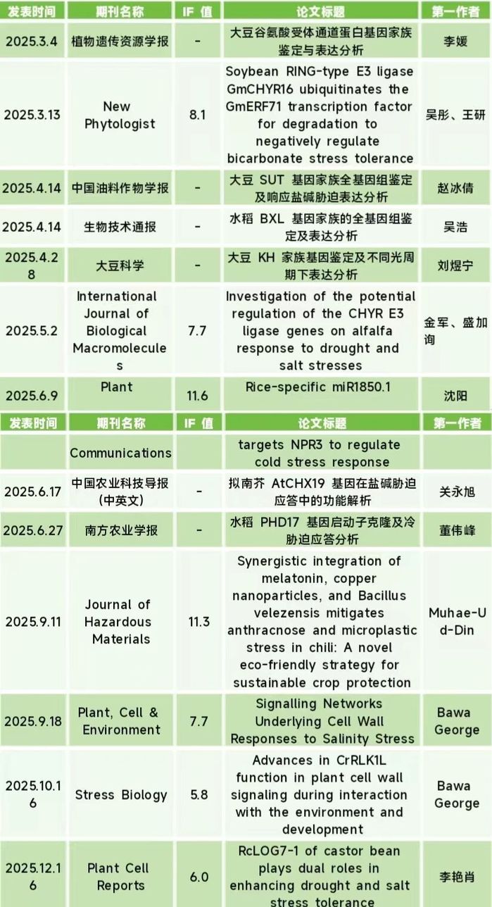 2025年度,团队聚焦作物逆境响应机制、耐逆基因功能解析及分子育种策略等核心领域开展系统性研究,成果丰硕,在《New Phytologist》、《Plant Communications》、《Plant, Cell & Environment》等一区TOP SCI期刊发表多篇高水平论文,为作物抗逆性改良的理论研究与应用实践提供重要参考。