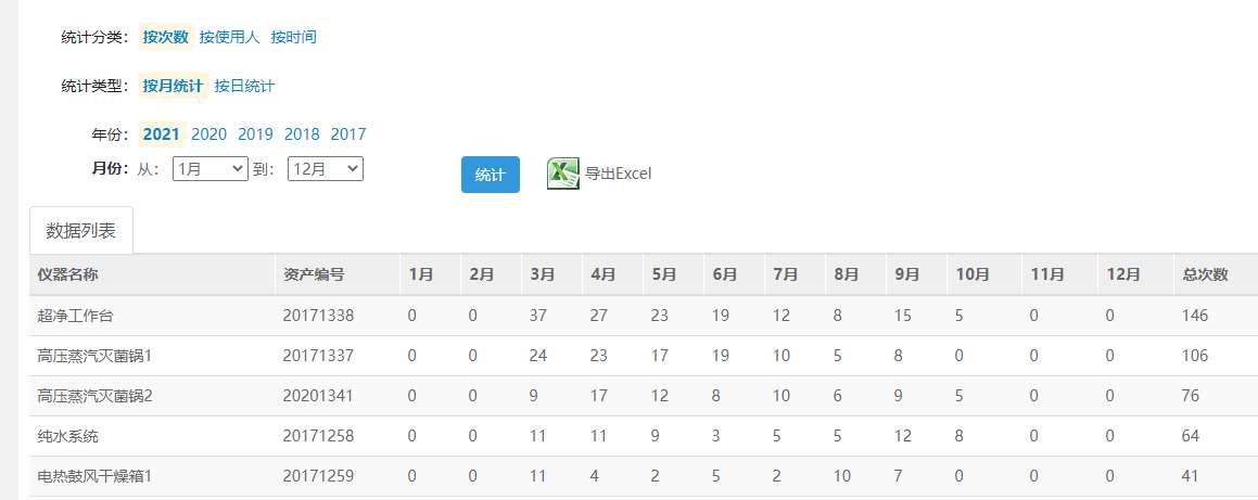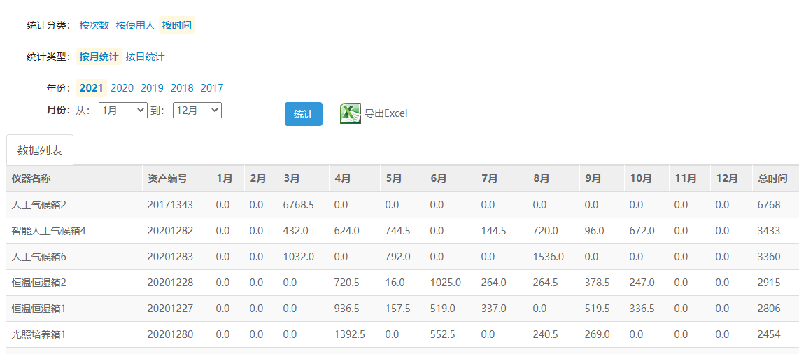 7、实验室仪器的预约使用情况数据可随时调取,数据可通过excel表格导出,数据包括每台仪器的使用时长和次数、每台仪器的使用者、使用每个实验室的预约仪器的人数名单。单台仪器可查预约率、使用率。总的统计数据可见图。